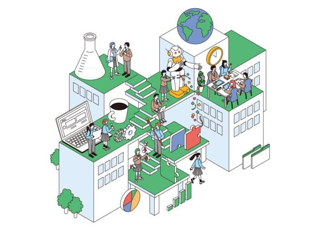 最初の信号でY字路を斜め右へ、「猿楽通り」を進む。お茶の水小学校・錦華公園を右手に見ながら2分ほど道なりに進むと左手に見える「猿楽町SSビル」の3F